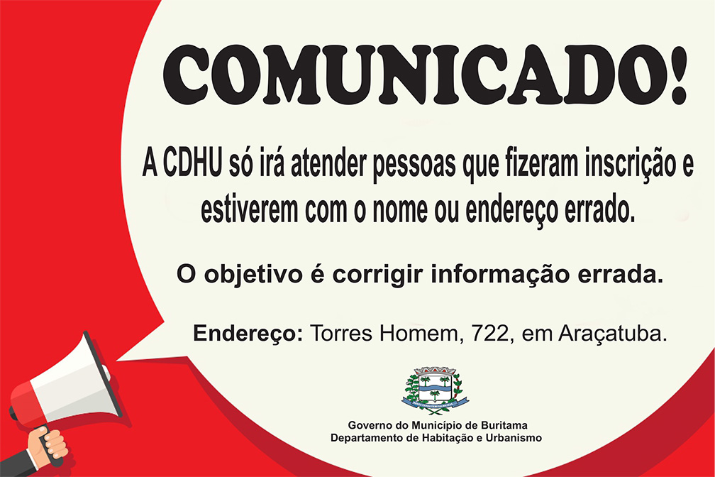 O Departamento de Habitação e Urbanismo informa às pessoas que fizeram inscrição para participarem do sorteio do conjunto habitacional Buritama G2 e estiverem com endereço ou nome errado na inscrição, precisam fazer a alteração. Para corrigir a informação, o morador deve levar cópia da inscrição, do documento pessoal e do comprovante de endereço até a CDHU (Companhia de Desenvolvimento Habitacional Urbano), localizado na rua Torres Homem, 722, em Araçatuba.