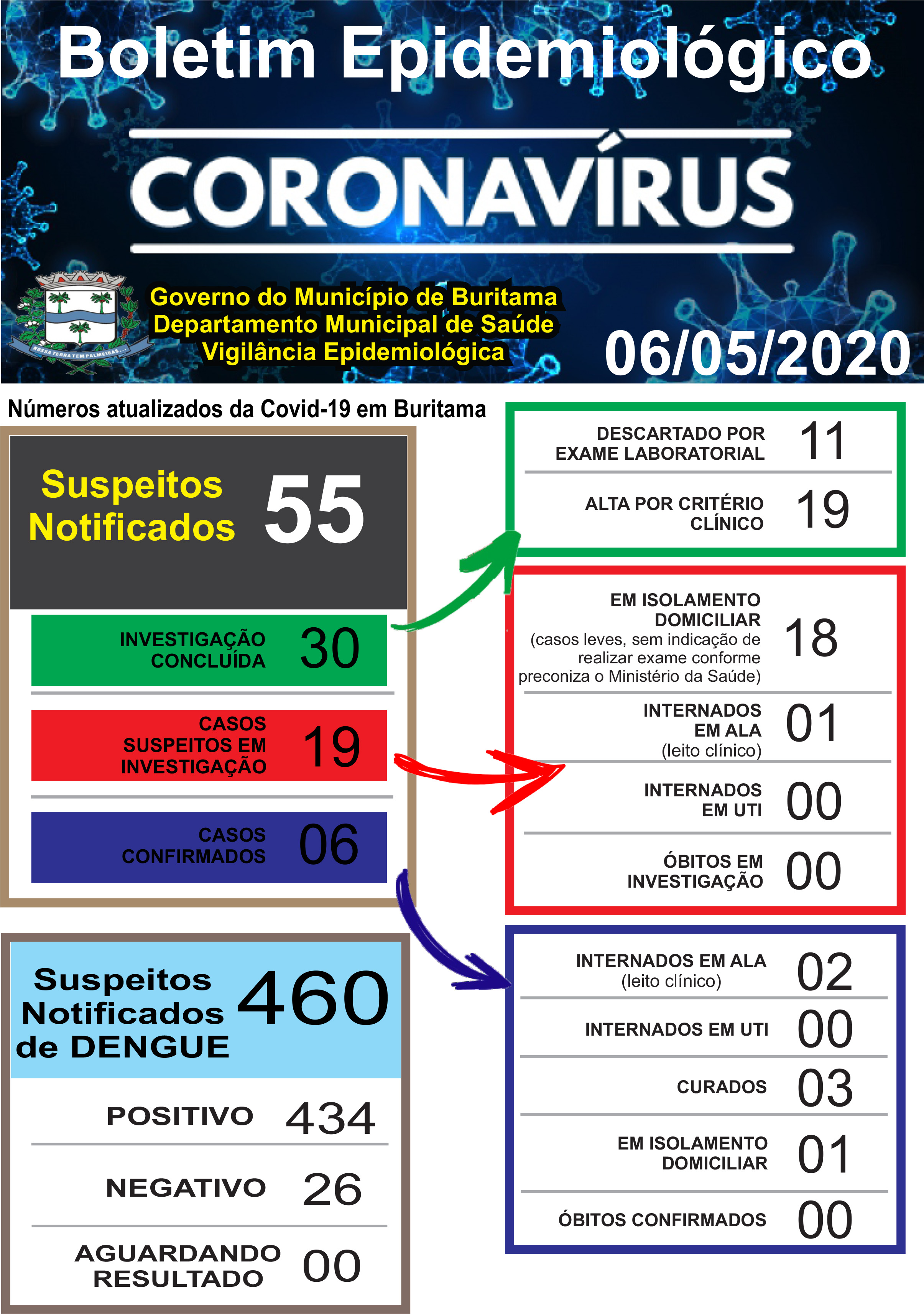 O Departamento Municipal de Saúde atualizou hoje (6), o boletim epidemiológico de Buritama. Neste documento, os moradores poderão acompanhar os detalhes dos números de casos de Covid-19 e dengue.