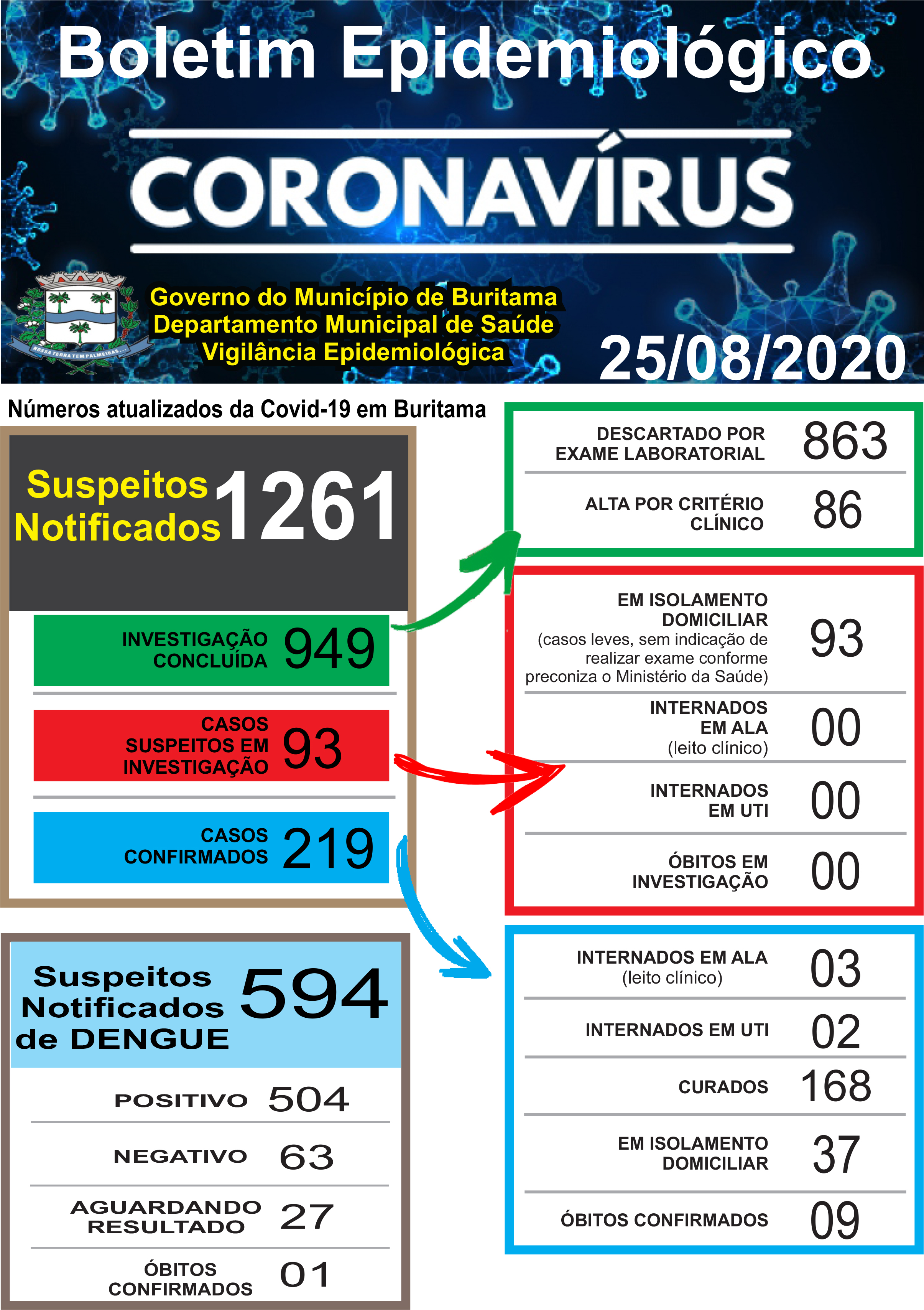 O Departamento Municipal de Saúde atualizou hoje (25), o boletim epidemiológico de Buritama. Neste documento, os moradores poderão acompanhar os detalhes dos números de casos de Covid-19 e dengue.