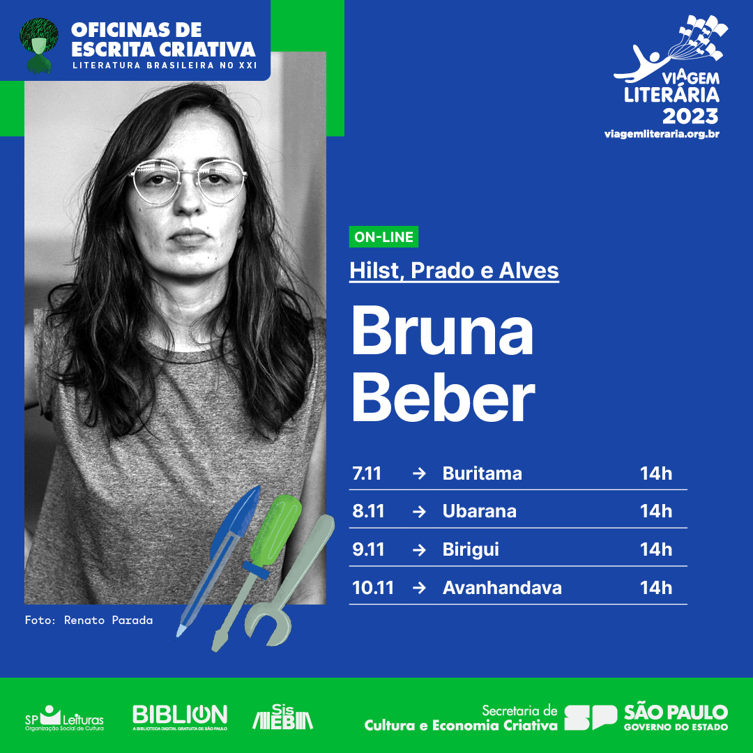 O Departamento de Cultura realiza bate-papo literário com Bruna Beber, poeta, tradutora e mestra em Teoria e História Literária. O encontro gratuito acontece no dia 7 de novembro, às 14h, na Biblioteca Municipal de Buritama. O público poderá acompanhar um pouco sobre as obras das escritoras Hilst, Prado e Alves.
