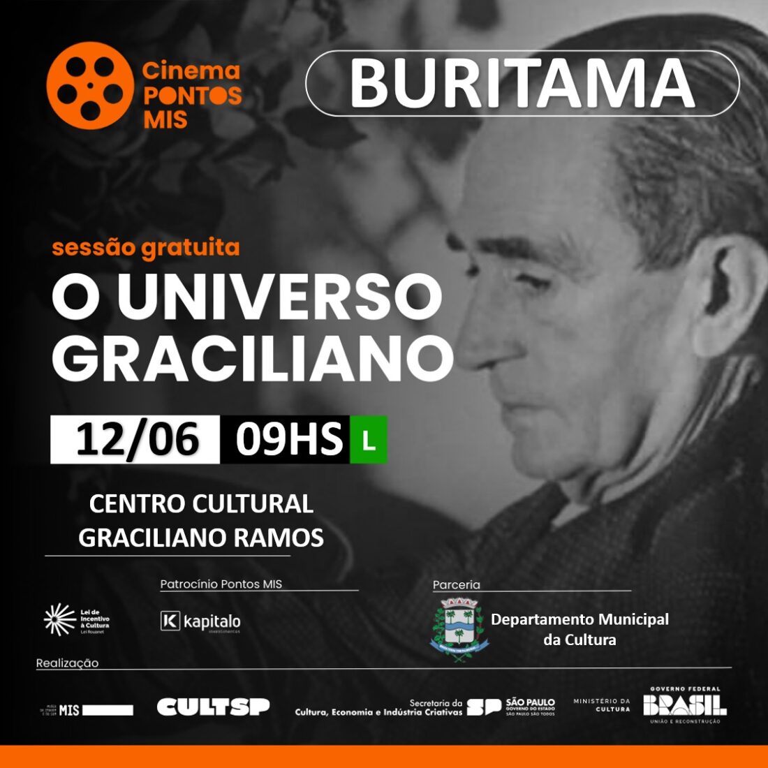 A Biblioteca Municipal de Buritama promoverá a primeira sessão de cinema gratuita nesta quarta-feira (12). O filme de abertura será ‘Universo Graciliano’, a partir das 9h, com classificação livre. O filme combina diversos materiais de arquivo com entrevistas de pessoas próximas ao escritor.