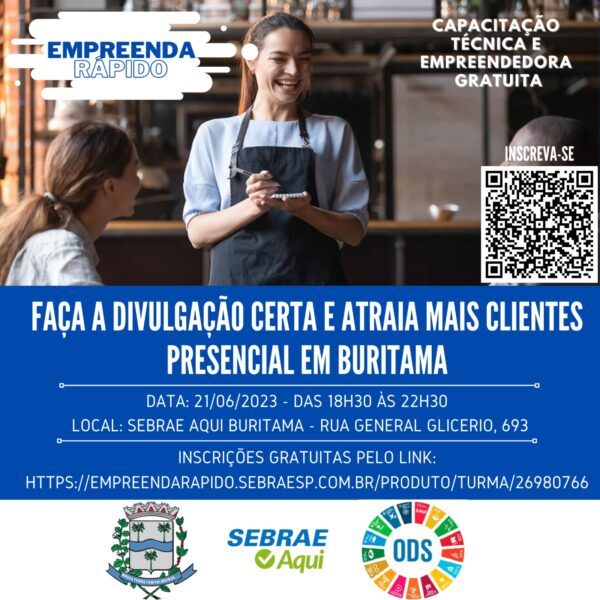 22 de junho de 2023O Sebrae Aqui Buritama abriu inscrições gratuitas para o curso de ‘Faça a divulgação certa e atraia mais clientes’ que acontece nesta quarta-feira...